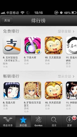 但自今年下半年以来,腾讯游戏和金山网络的出现打破了固有格局,两家公司几乎完全依靠内部资源进行推广,榜单成为成功推广的外部表现,而不再是用户来源的依赖。自腾讯发布第一款游戏起,天天游戏系列长期霸占APPStore双榜前列的位置,令业内惊叹;11月21日,金山网络首款卡牌游戏《天天爱西游》上架首日即冲进免费榜单第5,并连续霸榜3天,取得双榜前10佳绩,业内再次震惊。据数据显示,腾讯微信、手机QQ等产品在IOS端目前所覆盖的用户数仅次于APPStore;而金山网络旗下电池医生、猎豹浏览器、手机毒霸等产品在IOS端的总用户数位列国内第三。
