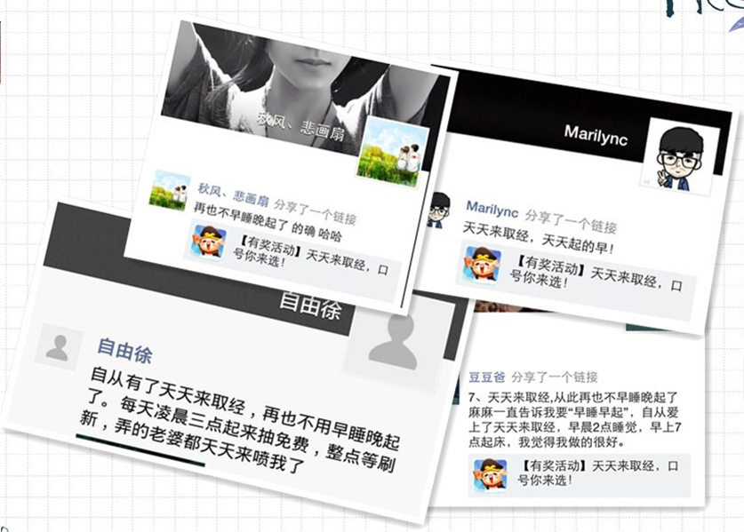 豆豆爸说,自从爱上天天来取经,早晨2点睡觉,早上7点起床……《天天来取经》帮他养成了早睡早起的好习惯!自由徐说,自从有了天天来取经,再也不早睡晚起了!《天天来取经》帮他改掉了睡懒觉的习惯!