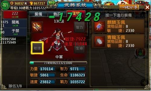麒麟玉佩,提升敏捷2330点。装配后可提升速度15844点、战斗力17428点!速度流的春天果然要来了么!