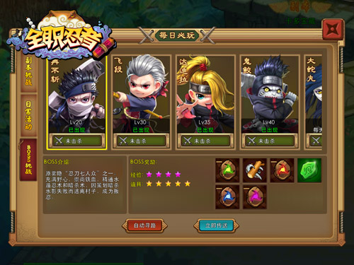 当任务经验不足的时候,建议玩家优先完成忍者任务。忍者任务是可通过刷新获得更高奖励的任务。这里的任务都非常简单,轻轻松松就能拿一两百万经验,绝对是赚经验的首选。经验指数:☆☆☆☆ 奖励指数:☆☆