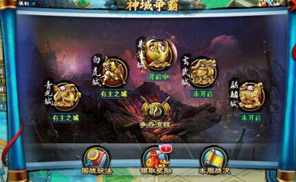 神城争霸共有5座神城可供争夺占领,分别是:青龙城、白虎城、朱雀城、玄武城、麒麟城;