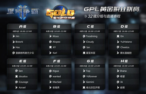 8月5日GPL黄金职业联赛32强小组赛第一日开打,A组小组中包括Jim大神、中国台湾神族Has、F91首席弟子雷天同以及香港同胞Bistork,NEOTV将在8月5日晚上18:00点带来A组小组赛直播。