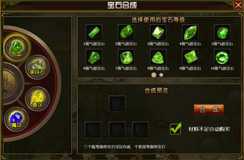 游戏中的宝石共分七种:物攻宝石提高玩家物理攻击上限,道攻宝石提高玩家道术攻击上限,法攻宝石提高玩家法术攻击上限,物防宝石提高玩家物理防御上限,魔防宝石提高玩家魔法防御上限,气血宝石提高玩家血量值上限,黑铁石强化武器。七种不同属性的宝石都是从低级合成到高级的,高等级的宝石带来的属性加成是十分丰厚的。宝石等级最高为10级,玩家可以通过变强界面的宝石合成或者合成NPC开启合成功能,3颗同等级相同属性宝石可以合成一颗高等级宝石,方法简便易懂。