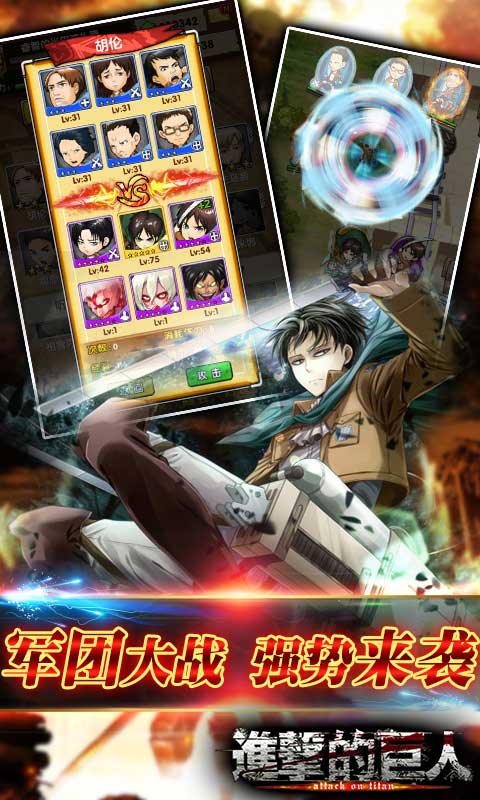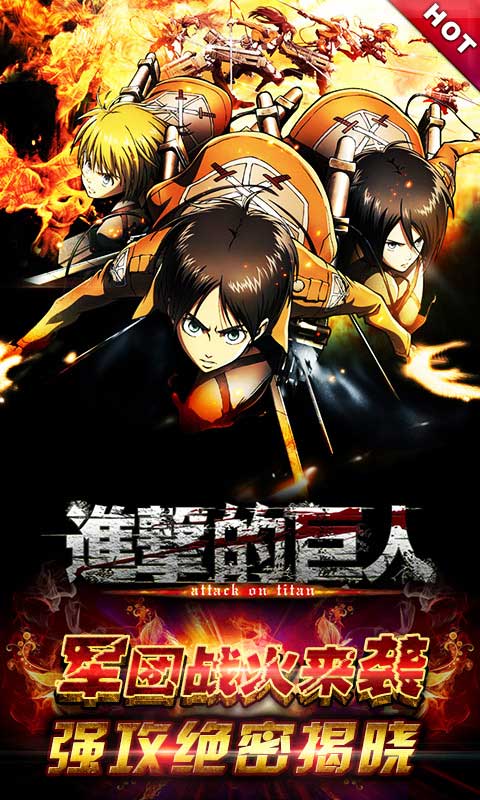 由全球上百万动漫迷追捧的火爆动漫改编的同名手游《进击的巨人》军团战火来袭,随着公测的火爆进行,游戏线上军团战全面打响,调查兵团、驻扎兵团、宪兵团、训练兵团全线出击,开启最疯狂的进击战场!同时,还有你不能错过的强攻绝密揭晓,登陆《进击的巨人》与艾伦并肩作战,将巨人全部歼灭一个不留!
