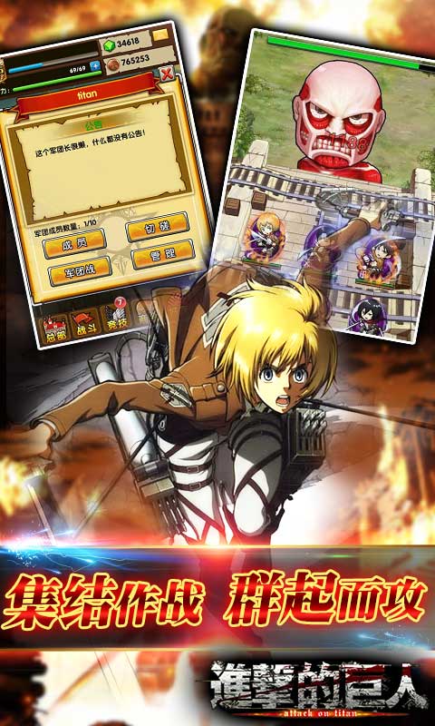 最后,集结作战则是重中之重!《进击的巨人》不同于其他的手游,它独创的军团系统是以交互为目的的集结作战,从此组队打怪不再是客户端游戏的专利,手游照样可以结识战斗伙伴!因此,运用军团中所有的小伙伴进行作战配合,组合成长距离索敌阵型,以瞬间击败巨人,彰显团队合作的意义!