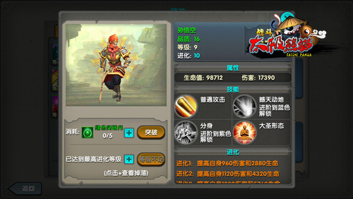 技能1:旋转大棒一周,砸向地面(金箍棒会变长);技能2:吹一口毫毛,召唤2只一摸一样的孙悟空出来战斗,持续10秒。