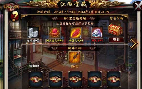 江湖宝藏活动玩法,考验的就是运气就是RP!玩家进入活动界面后可以看到有五张卡片,牌面分别对应枪、刀、扇、笔、剑五类武器图标,只要玩家翻出牌达到指定目标即可获得丰富的奖品。玩法虽易,但运气很重要,玩家在活动期间每天只有5次翻牌机会,所以想测试一下自己的RP就来玩江湖宝藏活动吧!