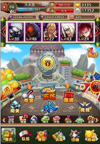 我们最初的设计理念是让玩家一进入游戏就能够感受到扑面而来的火影视觉冲击,因此我们选取了各国的著名建筑为背景,火之国的历代雕像、风之国的沙漠奇观等。最上方,我们决定放已有忍者小头像,因为这样既方便玩家查看阵型情况,也能增加火影粉丝的亲切感。另外,玩法的选择我们决定采用滚动模式,这样可以让玩家不至于太单调,并且滚动的建筑也都是火影中熟悉的场景,如一乐拉面馆、忍者村、忍具商店等建造毫无违和。