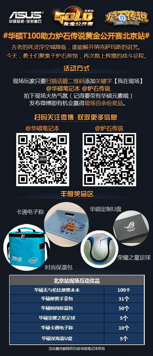 #华硕T100助力炉石传说黄金公开赛北京站#现场玩家只要扫码添加关键字【我在现场】@华硕笔记本 @炉石传说 拍下现场火热气氛(记得要带有华硕元素哦)发布微博,现场百份奖品等着你。