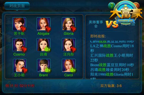 与精英的solo对决才能让自己快速的成长,通过商会主界面中间“决战商海”按钮可以开启或加入决战商海的比赛,和商会同僚一起向“世界百强”企业精英发起挑战,相互切磋学习,一决高下。玩家可以在全天任意时间内参与决战商海的比赛,与“世界百强”的精英选手进行较量。