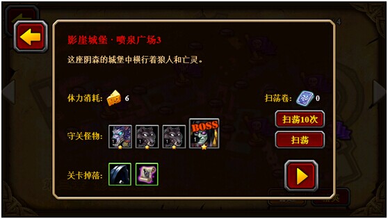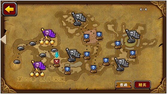 在副本界面中,我们可以看到每章副本的地图。在这地图上有众多的关卡,玩家们需要做的就是依次进行挑战。《酋长萨尔》的副本系统采用的是线性模式,每个关卡都需要逐个去挑战。所以骚年们,想要快速的刷通副本的话只能够老老实实的清好每一波小怪,不要妄图像魔兽那样去尝试跳怪哦。
