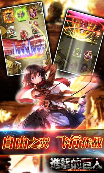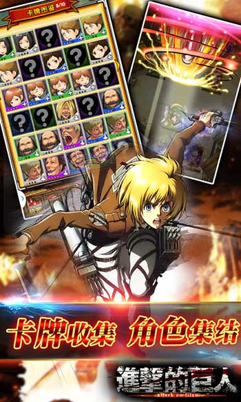 由全球上百万动漫迷追捧的火爆动漫改编的同名手游《进击的巨人》线上火爆开启史上最惨烈的战争,调查兵团、驻扎兵团、宪兵团、训练兵团全线出击,百大军团玩家强力奋战!复仇战役爆发,登陆《进击的巨人》即刻与艾伦并肩作战实现复仇觉醒,将巨人全部歼灭一个不留!