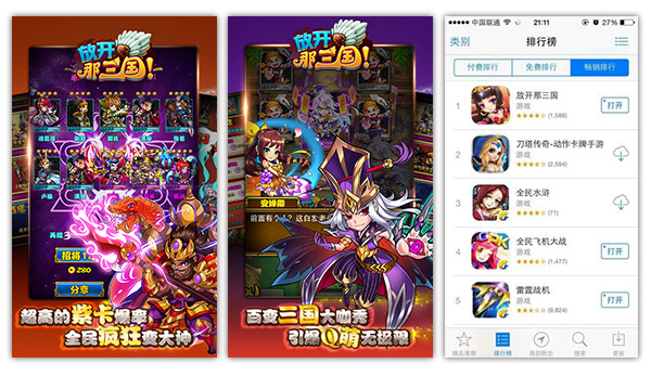 就在不久前, S级卡牌手游《放开那三国》登顶App Store畅销榜榜首! 。《放开那三国》自苹果商店限免以来,便在IOS畅销榜获得第4(除微信游戏外的第1)的傲人成绩,当之无愧的成为了2014年最热卡牌手游。