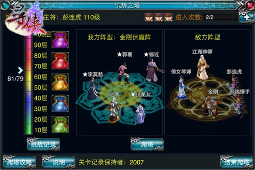 试炼之塔代表着《寻侠OL》武林中的最高战力,只有武学根基到达50级以上的玩家才能进行挑战,玩家每天拥有两次免费进行挑战的机会,通关一层关卡后将自动晋级到下一层进行挑战,挑战次数用完后需要等待第二天刷新才能继续挑战,此外拥有足够财富的玩家可以消耗元宝来购买挑战次数。试炼之塔共有百层,每一层都有一个实力强大守关者,其中每隔20层挑战的难度会上升一个档次,80-100层的挑战难度最高通关后得到的奖励也越丰厚。