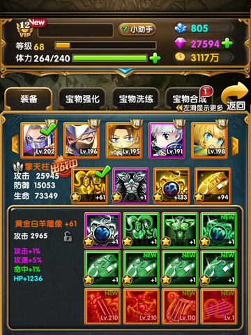 点击《进击吧!勇者》 “主页”-“装备”就能进入到装备系统界面,每个英灵可以佩戴4件装备。“宝物”可以通过“宝物强化”界面,消耗道具“星痕碎片”和“雅典娜之血”进行强化升级。装备最高可达300级,极大提升装备属性,保证能让你感受到超乎想象的战力提高!,