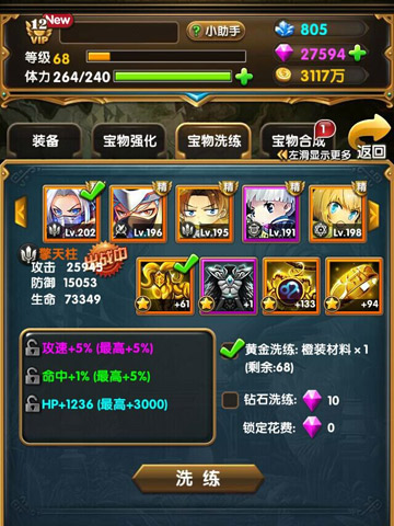 《进击吧!勇者》里面每件宝物都会拥有“特定属性”,防御加成、伤害反弹、攻速提高、暴击伤害、伤害反弹等等,众多逆天特性尽显宝物精髓。宝物特性分为“绿色”、“蓝色”、“紫色”三个品级,勇者们可以通过“宝物洗练”来调整宝物的品级和属性各类。所有你理想中的属性都可以在这里洗练出来,快来打造属于你的梦幻装备吧!