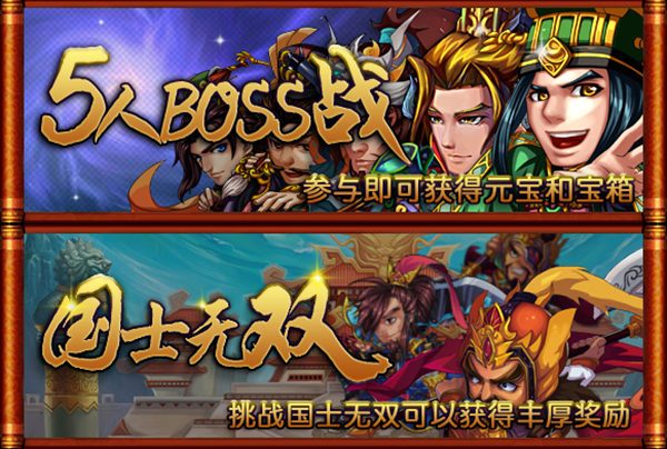 两大活动,限时开启,让你体验全新的三国乐趣。在活动期间每日中午的12:00-12:30,晚上20:00-21:30都将开启【国士无双】与【5人BOSS战】,每日只有两次机会,各位主公要好好把握哦!