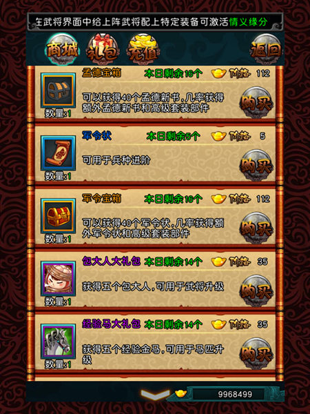 报告主公!三国商城又一次发生震动,所有的商品价格显示异常!【进阶宝箱】、【孟德宝箱】、【军令宝箱】、【包大人大礼包】、【经验马大礼包】都将以7折的价格出售,机不可失,失不再来啊!