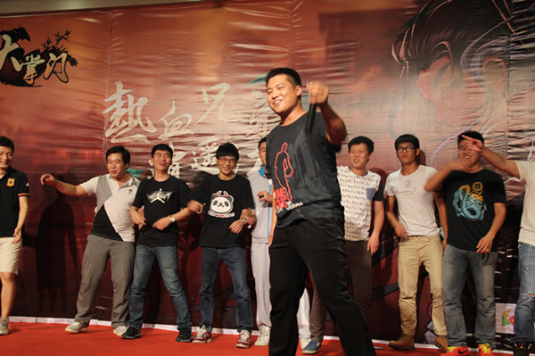 随着活动过半,现场的气氛越来越欢乐。随着一位掌门演唱的《精忠报国》,现场开启欢乐模式。玩家们纷纷上台表演节目 ,几位玩家自编自演绝世武功“葵花宝典”小话剧、美女玩家的新疆舞等节目为大家带来一阵阵笑声;最后十几位玩家的集体舞《小苹果》将整个气氛推向高潮!