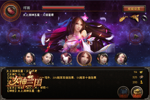 在女神系统中,来自仙界的十八位女神化作玩家的“学业导师”,以十八河图的方式来对各位玩家进行各种教学,增加包括主角在内的全员属性值,并且极具针对性。比如有的河图可增加马超、少年赵云、孙权等火系武将的被动技能等级,有的河图亦能增加通用的回避技巧的等级,功能非常强大。同时,这些性感婀娜的学业导师在战斗回合前,还会以“降临”的方式亲临助阵考研你的“学习成果”,想要在战场上取得先机的各位谪仙在平时“课堂”上可不要偷懒哦!