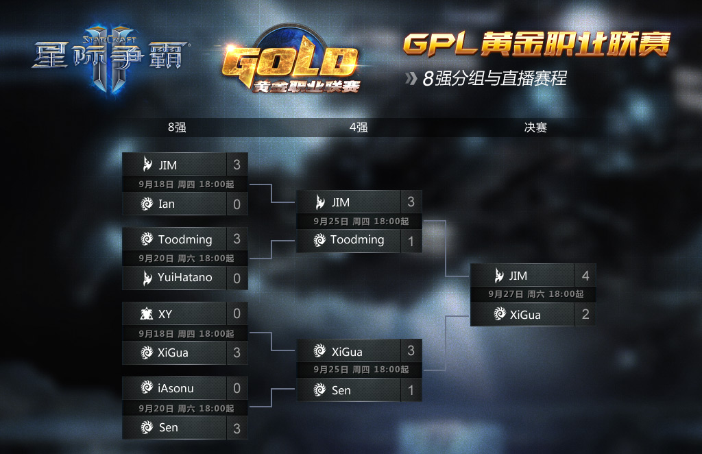 由网易和暴雪共同举办的首个官方《星际争霸II》职业联赛——黄金职业联赛在经历了近两个月争夺后,9月27日晚进行了第一赛季的最终决赛。iG战队的两位队友Jim与XiGua在经过了6场争夺之后,最终Jim以4:2的总比分击败了XiGua,从而获得了GPL黄金职业联赛第一赛季的冠军以及3万元奖金。