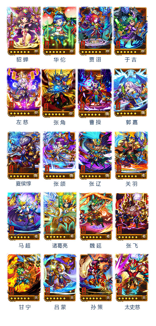 还在品味经典的紫卡原画么?你OUT了,新版橙卡,更酷炫的造型,更夸张的特效,飘逸的长发、炫目的效果,武神范儿关羽;魔化版张角、夏侯惇;英气逼人的诸葛亮、张郃,话不多说,上图是本次更新橙卡武将的卡牌,你们感受下。