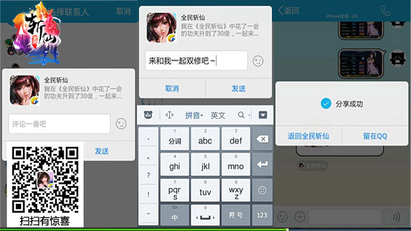 《心花路放》的徐福纵然有神乎其技的网聊泡妞大法,但也只能在微信、QQ上隔空聊天。你是否感觉这种隔靴搔痒的聊天,太过缓慢?没关系,《全民斩仙》已彻底打通微信、手机QQ,进一步拉近你和TA。