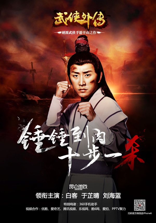 这样的白客你一定没见过!在海报中,白客一改往日屌丝形象,一身利落的短打,双手握拳眼神坚毅,脸上还带着几道伤痕,硬汉气场全开,背景是燃烧的剑冢,仿佛能看到武术高手浴血作战,整幅画面杀气十足,非常符合《武侠外传》硬派武侠开山制作的定位。