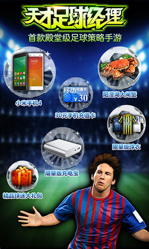 不仅如此,封测期间《天才足球经理》将举行首届网络足球世界杯,在比赛期间获得名次的玩家,将获得小米4智能手机,正版足球队服,球迷大礼包及30元手机话费充值卡等奖励。而阳澄湖大闸蟹也位列奖品之一,玩游戏,赢比赛,享三斤大闸蟹解馋装,绝对是封测活动中最为讨巧的一项奖品。