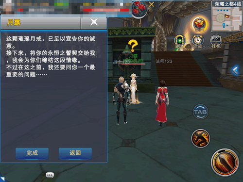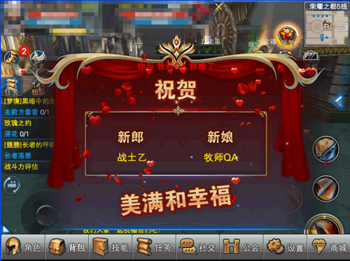 《神魔大陆》中五大职业,呈现两男三女架势,肌肉感战士与身手敏捷的刺客求爱于另三位女性职业血魔、法师和牧师。你只需邀请心仪的他/她组队做任务同甘苦即可结婚啦!男女双方共同完成任务,即可获取在王城NPC处登记结婚的资格。王城众NPC的见证及祝福下使用道具“永恒之誓契”,点击同意后完成结婚。