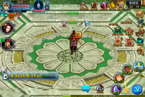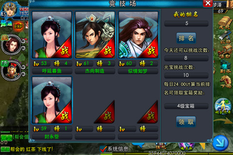 当玩家等级到达30级时,便会开启竞技场。玩家每日可免费挑战竞技场5次,也可使用元宝继续挑战10次。玩家点击“竞技”按钮打开竞技场界面,在界面中选取一名其他玩家进行竞技。右上角显示玩家的竞技排名。