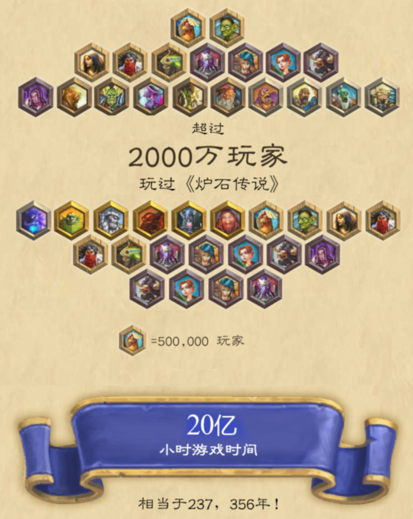 2013年10月24日,《炉石传说》国服开启首测。短短一年时间,这款当初只由15人团队研发,在发布时被暴雪称为“一个小玩意儿”的免费卡牌策略游戏已风靡全球。昨日,国服官网同步更新了炉石运营一年以来的数据分析,迄今为止,全球已有超过2000万玩家玩过《炉石传说》,总游戏时间达到20亿小时,相当于237356年!