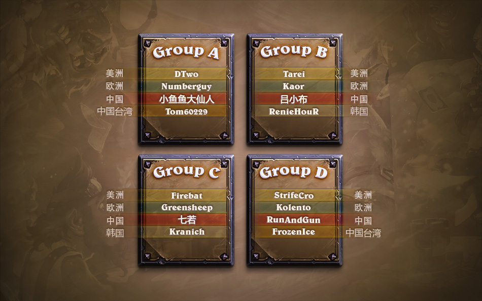 日前,本次《炉石传说》世界锦标赛分组名单已正式公布,中国队4位选手小鱼鱼大仙人 、 吕小布 、 七若、RunAndGun分别为A、B、C、D组。
