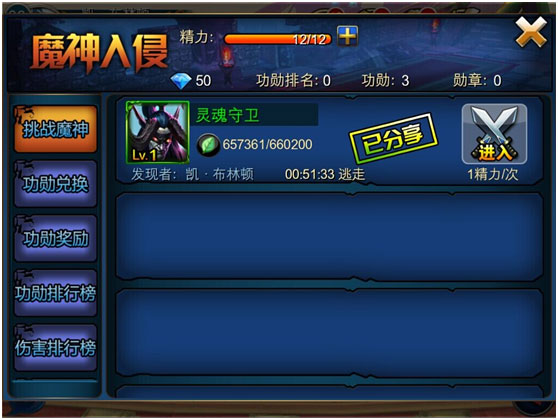 玩家在进入场景之后,有一道门挡在玩家和boss之间。玩家在选择战斗方式之后,玩家们方可与BOSS进行血战。各位撸友们可不要小看这个魔神哦,如果在规定时间内,玩家们没有击败这个穿越过来的魔神的话,它就会获得一个极其变态的“狂暴”buff,能够瞬间秒杀所有玩家。所以,不想看到“大侠,请重新来过”的玩家们,请在与魔神交战时活力全开,将你的怒火宣泄在这个邪恶的魔神上吧!