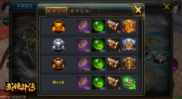 《武侠外传》新版本新增巅峰系统,分为两个部分:单人PVP单挑的巅峰之路、多人PVP混战的巅峰之战。巅峰之路每日举行,玩家需要一层一层地向前挑战,最多每日可挑战20层。巅峰之战每周日晚上9:00举行,根据本周7日间的巅峰之路的成绩排名,筛选出服务器的代表参与比赛,分为巅峰场与高手场,其中巅峰场就是本周最强高手之间的对决,获胜者将获得无限荣耀。