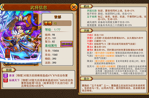 张郃在紫卡时代就是魏国的主力阵容之一,这次进阶橙卡一跃成为进攻核心,高伤、暴击、眩晕、还减4怒。定点杀人,对着周瑜、赵云等核心,运气好一回合让他们见阎王。惊天10:对暴击的武将发动攻击,造成200%的伤害,并且可以暴击!吕布,你别动,马超,你别跑。暴击就扇你嘴巴!这种输出能力,怕是司马懿也汗颜了。唯一的缺点就是,不能吸血!不过要是有了吸血,你让其他武将怎么活!