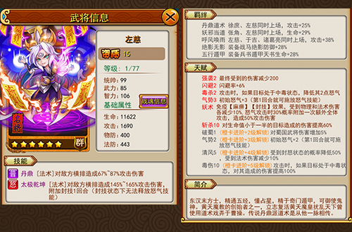 从《放开那三国》上架以来,被喷的最多的估计也就是左慈了,伤害低,缘分渣,封技搞笑控制,这回更新算是翻了身。怒气的伤害系数已然高过了橙卡张飞,总算是对得起了限时的身价。虽说封技依然搞笑,但毒伤10简直无情啊,直接翻倍的节奏。特别一提的是,左慈摆阵妥妥的放后排,跟在贾诩吕布之后,封技什么的请无视,输出绝不会少于目前的加+7紫于吉(用过的应该知道目前群雄于吉比吕布更加残暴)。哎,啥也不说了刚看到这个技能妥妥吓尿了,如果加上斩杀,半管血以下的都得死,橙将后瞬间成两个将,没办法,谁让人家是限时呢。