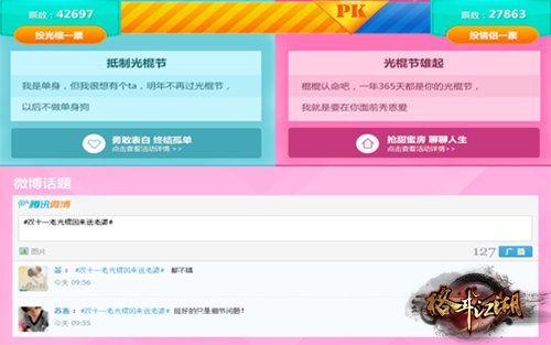 《格斗江湖》在光棍节期间发起了“抵制光棍节PK光棍节雄起”的投票大战!玩家们还可以以“双十一老光棍回来送老婆”为话题即时发表自己的看法,宣泄自己的情绪!谁说单身就要遭唾弃!讲出你的心声,让所有人帮你上热门上头条吧!