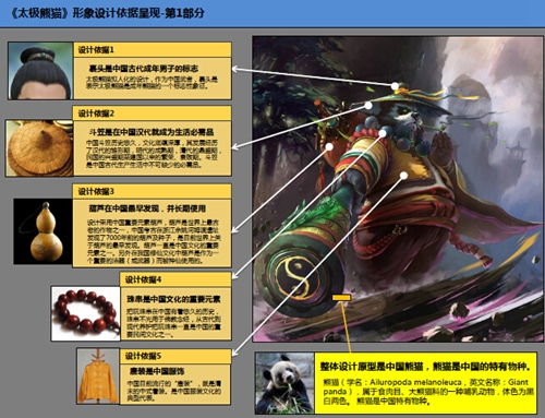 蜗牛负责人介绍,《太极熊猫》主角熊猫形象的设计灵感源自中国传统文化,主要通过在细节上参考公众认知的特色而进行原创设计。太极熊猫的穿戴饰品上分别融入了裹头、斗笠、武器葫芦、珠串、唐装、和式太极棒、龙纹雕刻、太极八卦、楚汉云气纹、中国结等传统文化符号,显然具备更为纯粹的中国血统,这些中国特有的文化表达方式,在《魔兽世界》熊猫人形象上是看不到的,两者有着显著的差异。为此,蜗牛相关美术人员对小编进行了详细说明如下: