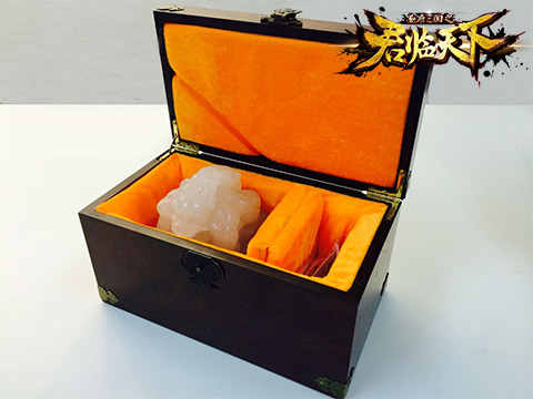 为保证玩家对玉玺的辨识,拍摄图片主体未经过处理,为完全实拍的玉玺实物摄影。此枚玉玺质厚敦实,触感冰凉光滑。印钮采用双头兽玉玺,印面则篆刻“君临天下”四个大字,以示其郑重的意义。