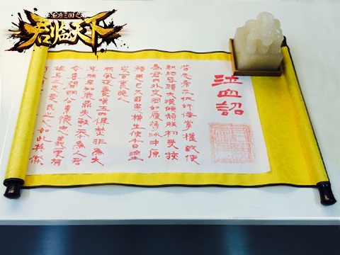 传国玉玺的“泣血诏”也同样有趣,“泣血诏”是东汉末年汉献帝破指洒血所撰,目的是为邀请各路英雄匡复河山,后人将其视为可领军卫国的荣耀。由于典故极为契合《君临天下》游戏主题,它也将送到首位全球第一的内地玩家手中。