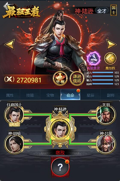 思路分析:陆逊由于优秀的四维归于全才,有多种技能可以选择。由于天赋,业火成为了陆逊必须学习的技能,四维的加成使得兵种的属性很强,配合上高额的四维。推荐学习鼓舞加强兵种;一般全才对位文官,武圣就成为了不错的选择;最后一个技能推荐学习乾坤,打出伤害的同时也可提高兵种减伤并且降低对方攻防。